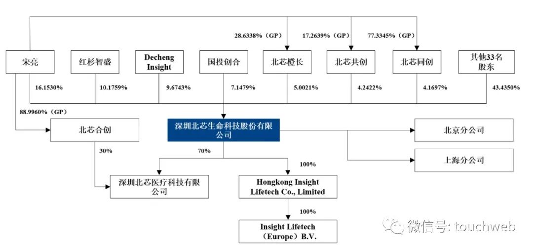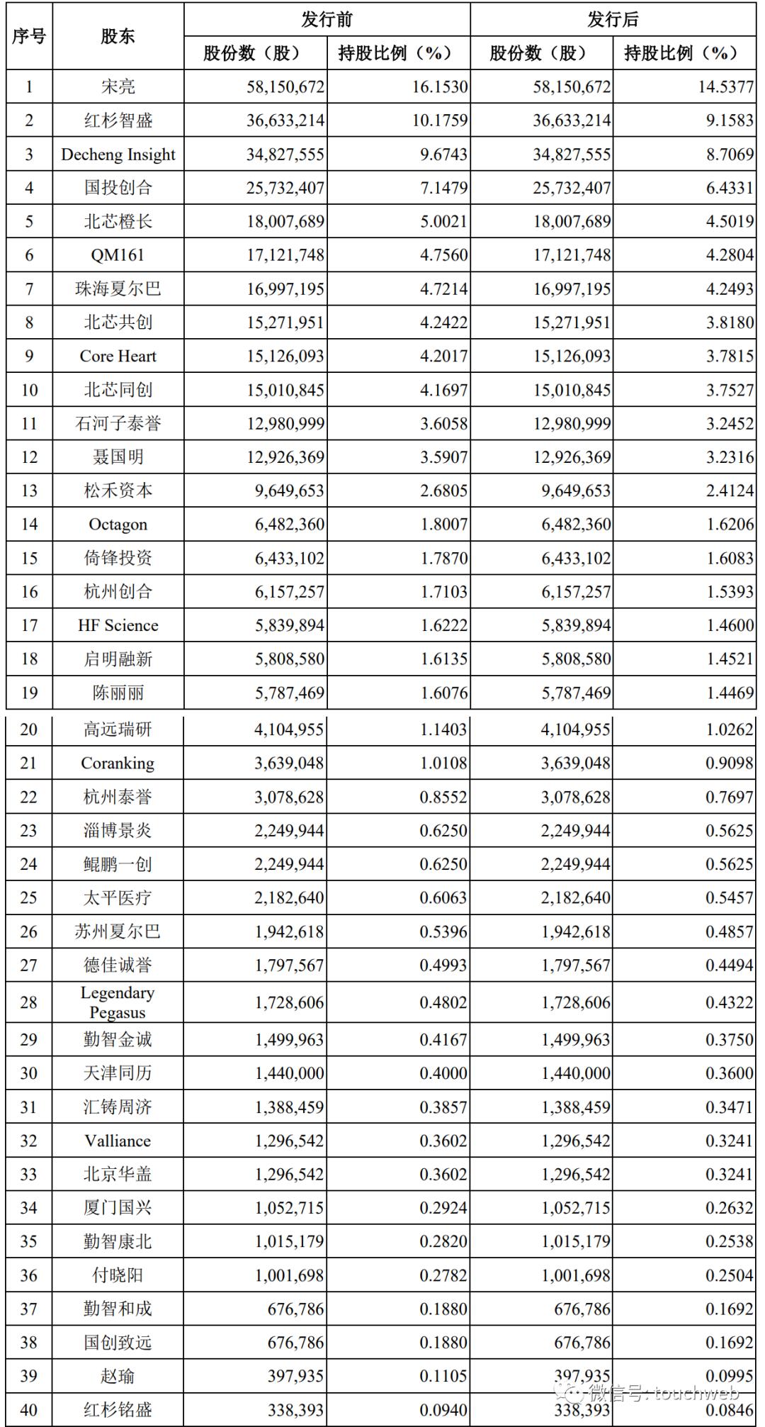 IPO后,宋亮直接持股为14.5377%,红杉智盛持股为9.1583%,Decheng Insight持股为8.7069%,国投创合持股为6.4331%,北芯橙长持股为4.5019%,启明旗下QM161持股为4.2804%,珠海夏尔巴持股为4.2493%,北芯共创持股为3.818%,Core Heart持股为3.7815%,北芯同创持股为3.7527%,石河子泰誉持股为3.2452%;