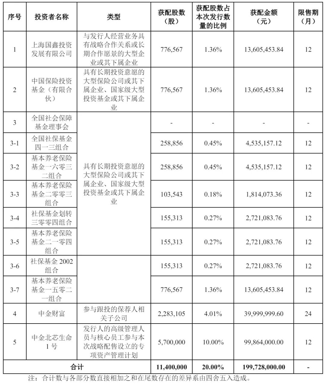 北芯生命基石投资者一共认购2亿元,其中,上海国鑫投资发展有限公司认购1361万元,中国保险投资基金(有限合伙)认购1361万元,全国社保基金四一三组合认购、基本养老保险基金一六零三二组合分别认购454万元,基本养老保险基金二零零三组合认购181万元,社保基金划转三零零四组合、基本养老保险基金二一零四组合、社保基金 2002组合分别认购272万元,基本养老保险基金一五零二一组合认购1361万元,中金财富认购4000万元,中金北芯生命1 号认购9986万元。
