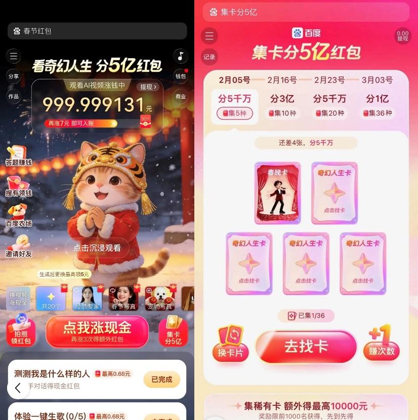 它并没有把所有筹码压在一次性拉新上,而是把红包拆进了多个使用场景里:用户需要通过内容参与、集卡、口令等方式逐步解锁奖励,周期长达46天,再叠加春晚这一高曝光节点,被引导反复回到文心助手。