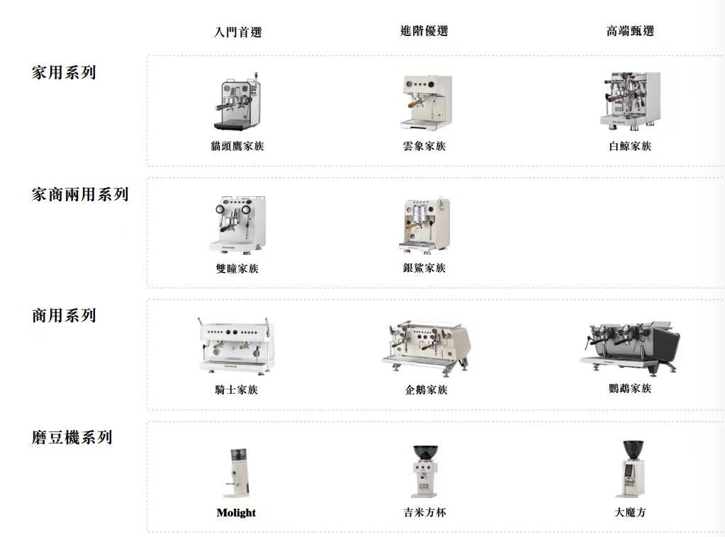格米莱形成了多系列、适配家庭、办公室、餐厅及咖啡馆等多元使用场景的意式咖啡机产品体系,主要产品包括家用意式咖啡机、家商两用意式咖啡机、商用意式咖啡机、磨豆机等等。