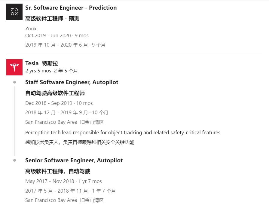 直到2017年,段鹏飞首次加入特斯拉,担任自动驾驶项目的高级软件工程师。