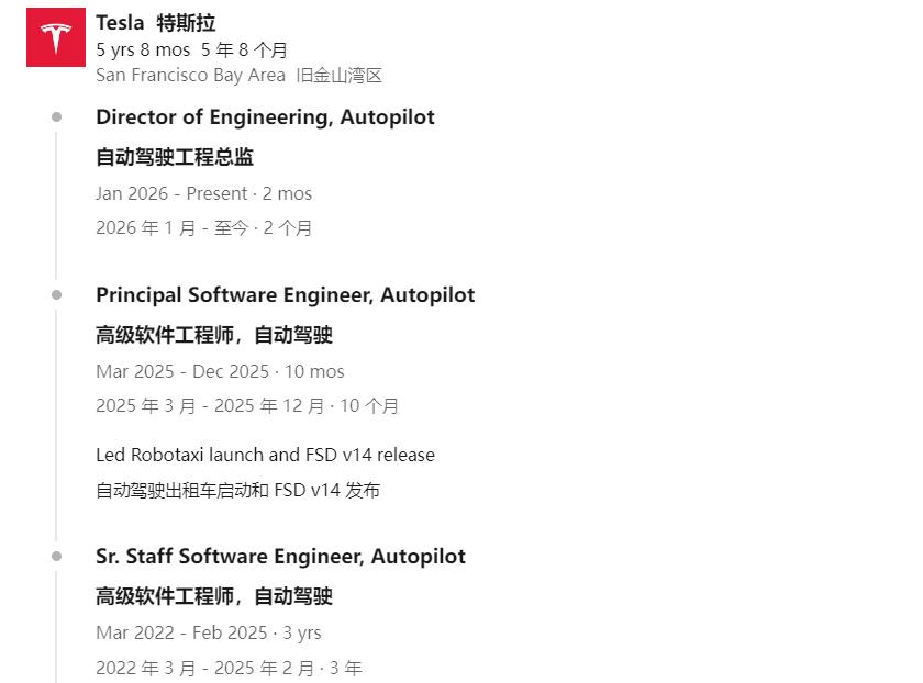 这位特斯拉Robotaxi的核心人物,已在特斯拉工作9年,升职前是公司首席软件工程师、FSD V14研发的带队者。