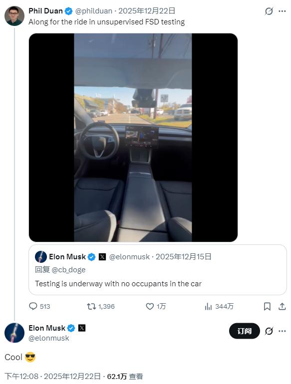 而段鹏飞就是首批参与无监督版测试的员工,他自己也在X上发布了当时的测试视频,前排空无一人,马斯克直呼“酷毙了”: