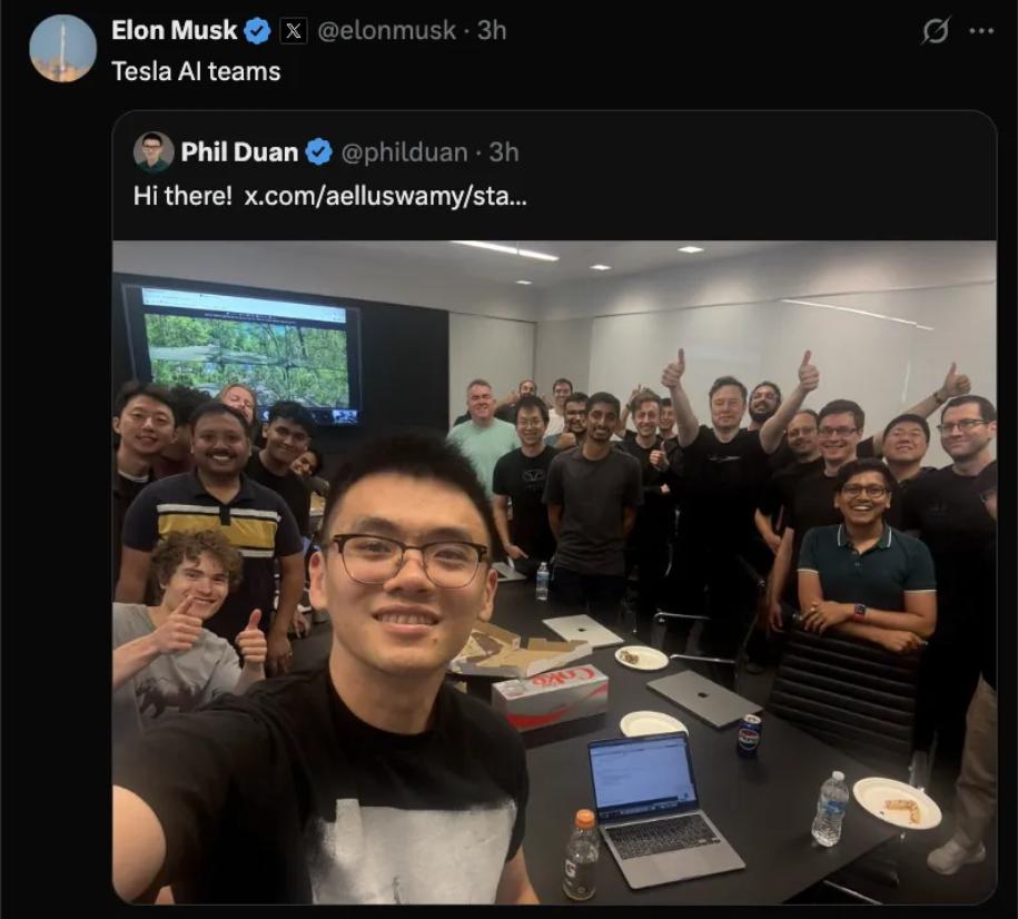 马斯克也在X上大加赞赏,转发了办公室庆功party的大合照,掌镜的这个中国面孔,就是段鹏飞。