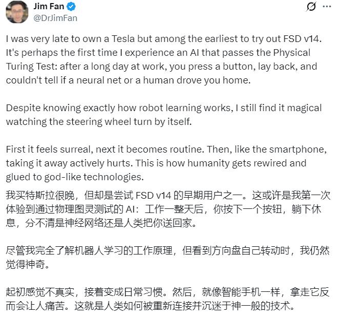 英伟达机器人部门主管及杰出科学家Jim Fan,还曾在体验过后表示,这是自己第一次体验到通过物理图灵测试的AI。