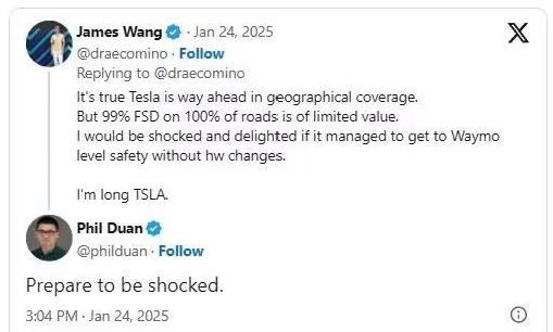 比如上个月末,长期持有特斯拉股票的用户James Wang发出质疑,认为特斯拉虽然在地理范围上领先Waymo,但技术上仍和Waymo相去甚远。