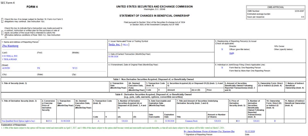 特斯拉最近向美国证券交易委员会(SEC)递交的文件显示:公司向汽车业务高级副总裁朱晓彤(Tom Zhu),授予了520021份股票期权。