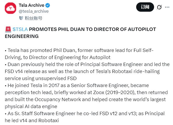 据Tsla Archive在社交平台X上透露,特斯拉FSD软件负责人段鹏飞(Phil Duan),现已晋升为特斯拉自动驾驶工程总监。