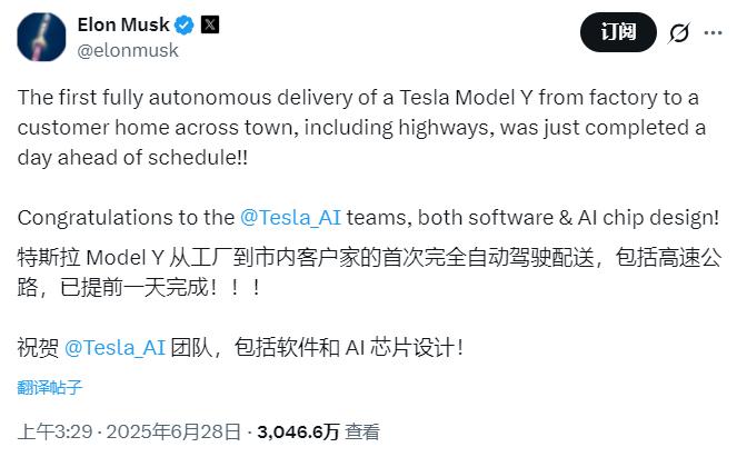 马斯克强调,这次交付横穿了城镇,路线包含高速公路,且车内没有任何人。