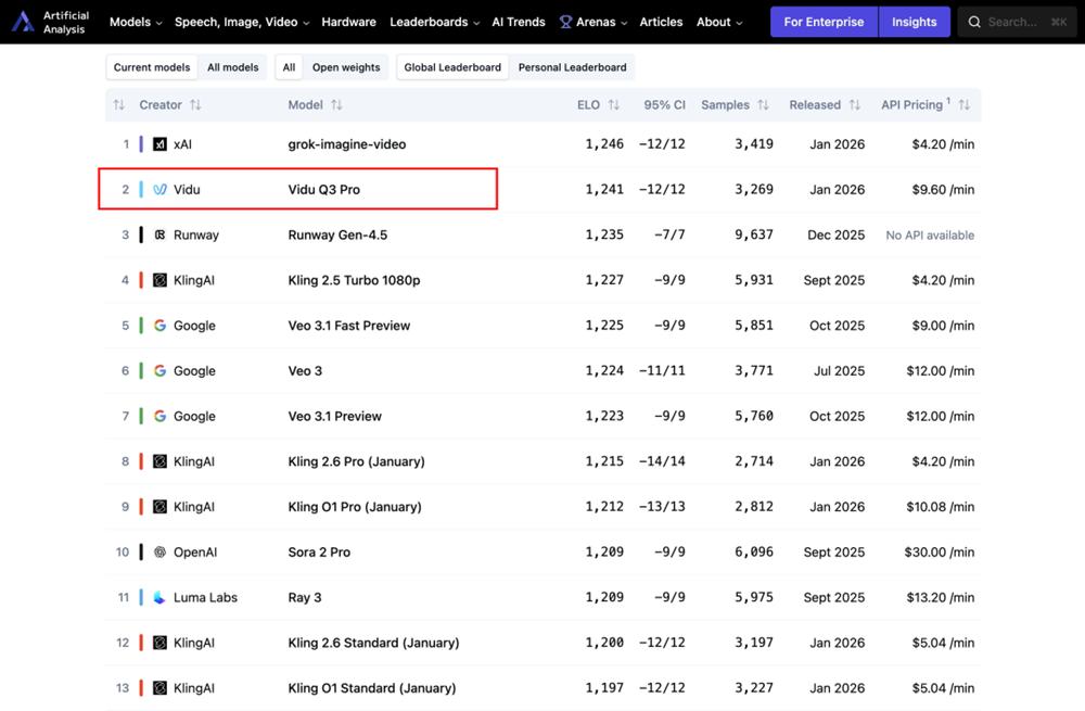 今年1月30日,生数科技发布了Vidu Q3模型,是一个主要面向专业级影视制作场景的视频生成模型。Vidu Q3在国际权威AI基准测试机构Artificial Analysis最新公布的榜单中,Vidu Q3排名中国第一、全球第二,仅次于xAI的Grok视频生成模型,超越Runway Gen-4.5 、Google Veo3.1和OpenAI Sora 2。