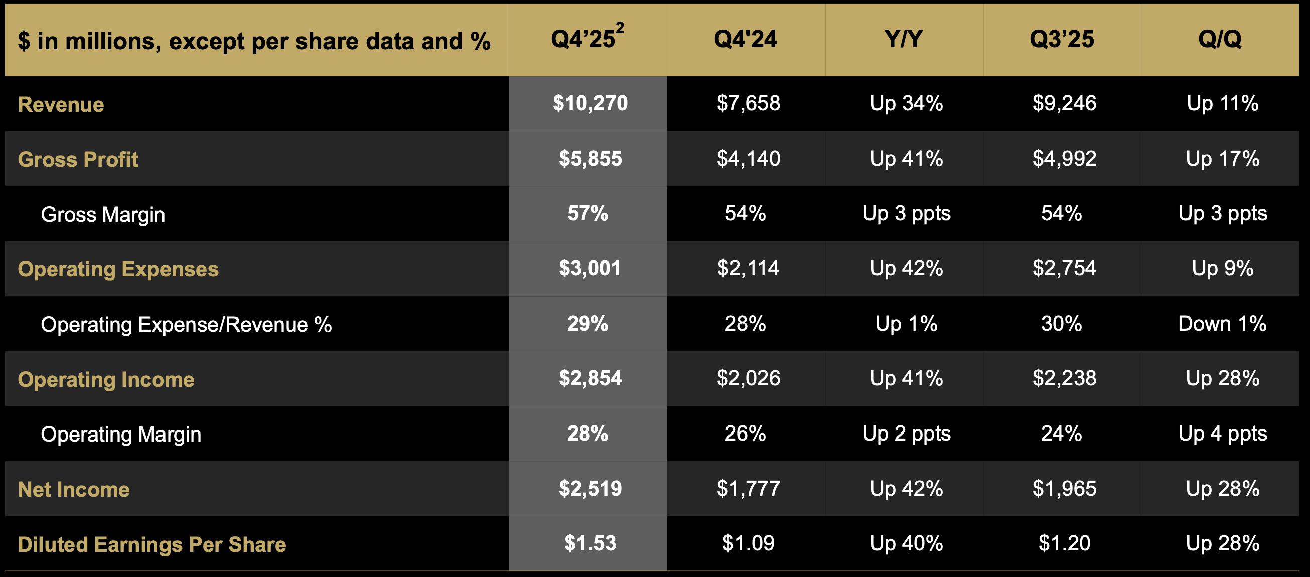 再来看利润,非会计准则下,AMD Q4净利润25.19亿美元,同比大幅增长42%;2025全年,AMD的净利润为68.31亿美元,同比增长26%。