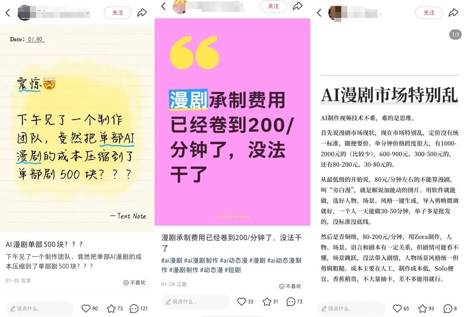 而在小红书上,大量AI漫剧从业者的诉苦贴更是一个比一个惨:“能有500播放量就不错了”“300万播放的漫剧收益只有500块”“报收不报支,大谈流水不谈利润”“画面bug多到窒息,调试全靠抽卡碰运气,本地部署要高价显卡,用平台工具得不停充值,实际门槛高到离谱”“外包套外包”……