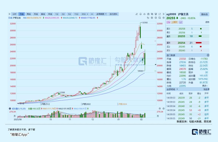 就在今天盘中,国际白银价格再度一度暴跌超12%,国内白银期货主力合约更是盘中大跌近20%,当天收跌10.85%,价格最低跌至18500元/千克,显著掉出周二“史诗级暴跌”时的最低价。