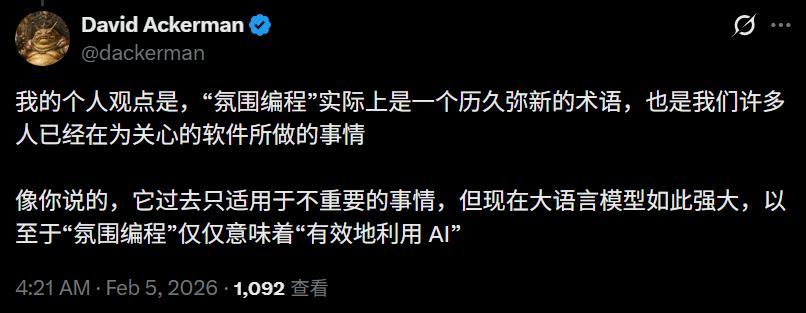以前「氛围编程」只适用于闹着玩,但现在模型太强了,这个词当下的含义其实很简单——就是「高效地利用AI」。