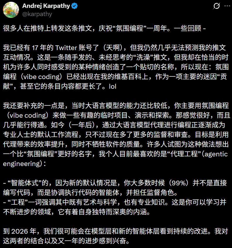 卡帕西宣判:Vibe Coding终结,99%代码AI接管,“智能体工程”时代开启