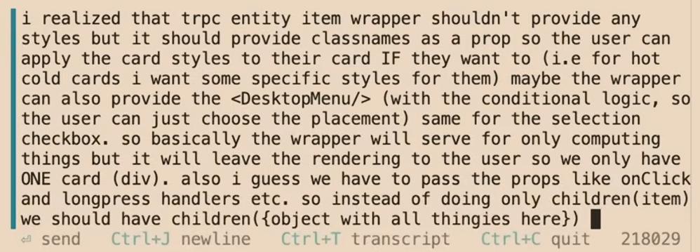 这种长达几分钟的语音输入,能把包含了人类直觉、逻辑推导、因果关系的丰富上下文完整地传递给AI。