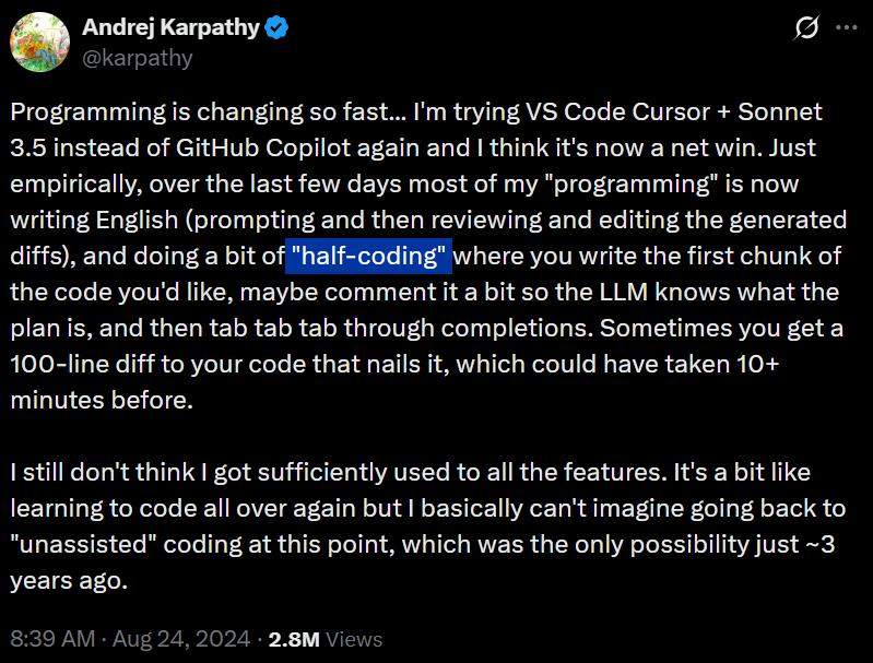 甚至Karpathy提到的「Half Coding」(看着AI写代码),在很多人那里也变了味。