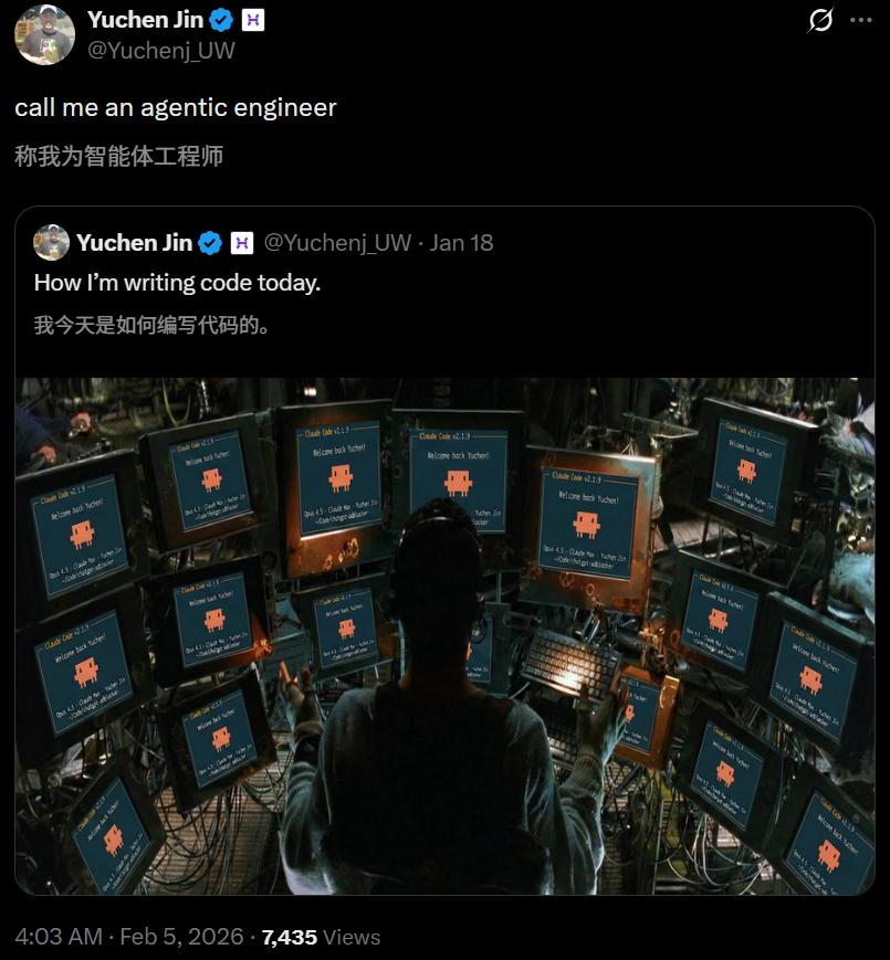 Yuchen Jin晒出了如《黑客帝国》般的屏幕矩阵,配文道:「称呼我为智能体工程师。」