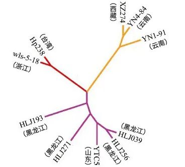 第一是,菌株具有明显的地理聚集性,呈现出“地缘越相近、基因越相似”的分布模式。有研究对10株不同地域来源的菌株进行了基因组分析,其中4株分离自黑龙江,2株来自云南,此外山东、浙江、西藏、台湾地区各1株。结果显示,黑龙江与山东分离菌株相近,西藏与云南菌株相近,台湾与浙江菌株相近(具体见下图)。
