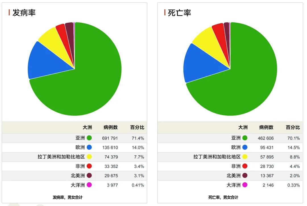 但这些发病和死亡并不是按人口比例、均等地分布在世界各地,亚洲是胃癌的高发区,占据了71.4%的新发病例和70.1%的死亡病例。