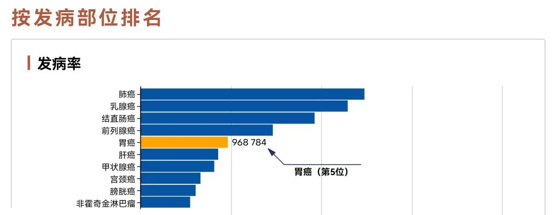 根据国际癌症研究机构(IARC)的数据,2022年全球新增胃癌病例约97万例,仅次于肺癌、乳腺癌、结直肠癌、前列腺癌,位列第5;死亡约66万例,仅次于肺癌、结直肠癌、肝癌、乳腺癌,同样位列第5。