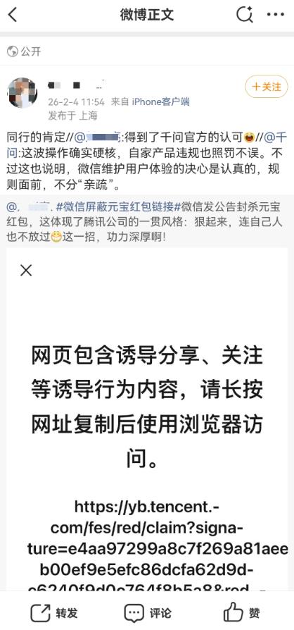 2月4日,微信突然对元宝红包链接采取了限制措施。当用户尝试在微信内打开这些链接时,会看到明确提示:“网页包含诱导分享、关注等诱导行为内容,请长按网址复制后使用浏览器访问”。