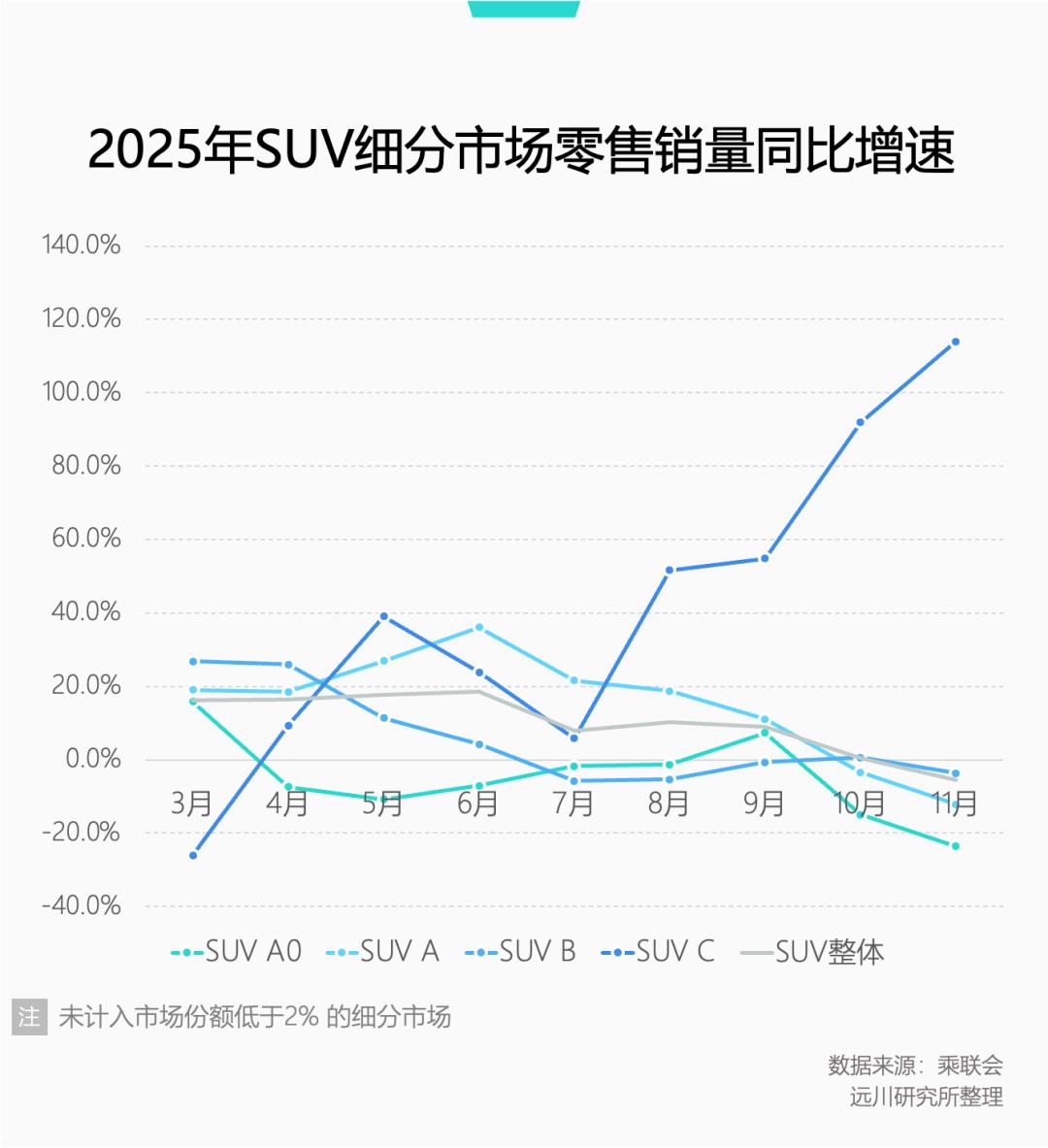 但去年下半年开始,大车的销量增速从数据层面实现反超。SUV整体增速止步于10%,中大型SUV在7月触底后迅速反弹,到11月成为SUV唯一记录在案的正增长市场。当月,中大型SUV卖了近10万辆,超过小型SUV。