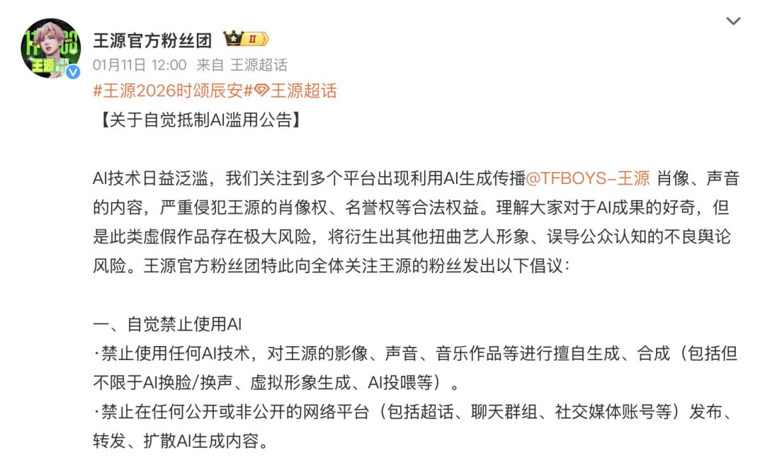 王源官方粉丝团发布的“抵制AI滥用”公告(部分)