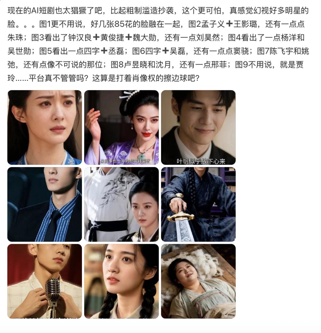 如果怕惹上什么问题,其实看现在市面上的AI短剧你就知道怎么解决了:把好几张脸融在一起就好了。你也说不清到底像谁、侵了谁的权,观众喜欢谁就能从这些脸上看出谁,每个人觉得像谁都不一样。