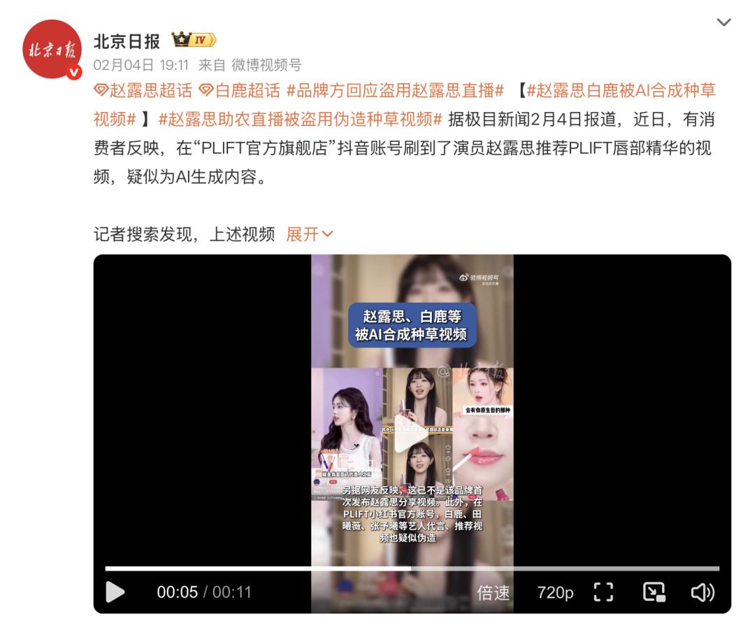 类似的事层出不穷,有媒体报道,疑似某品牌发布的演员赵露思、白鹿等人推荐产品的视频均为AI生成的内容。