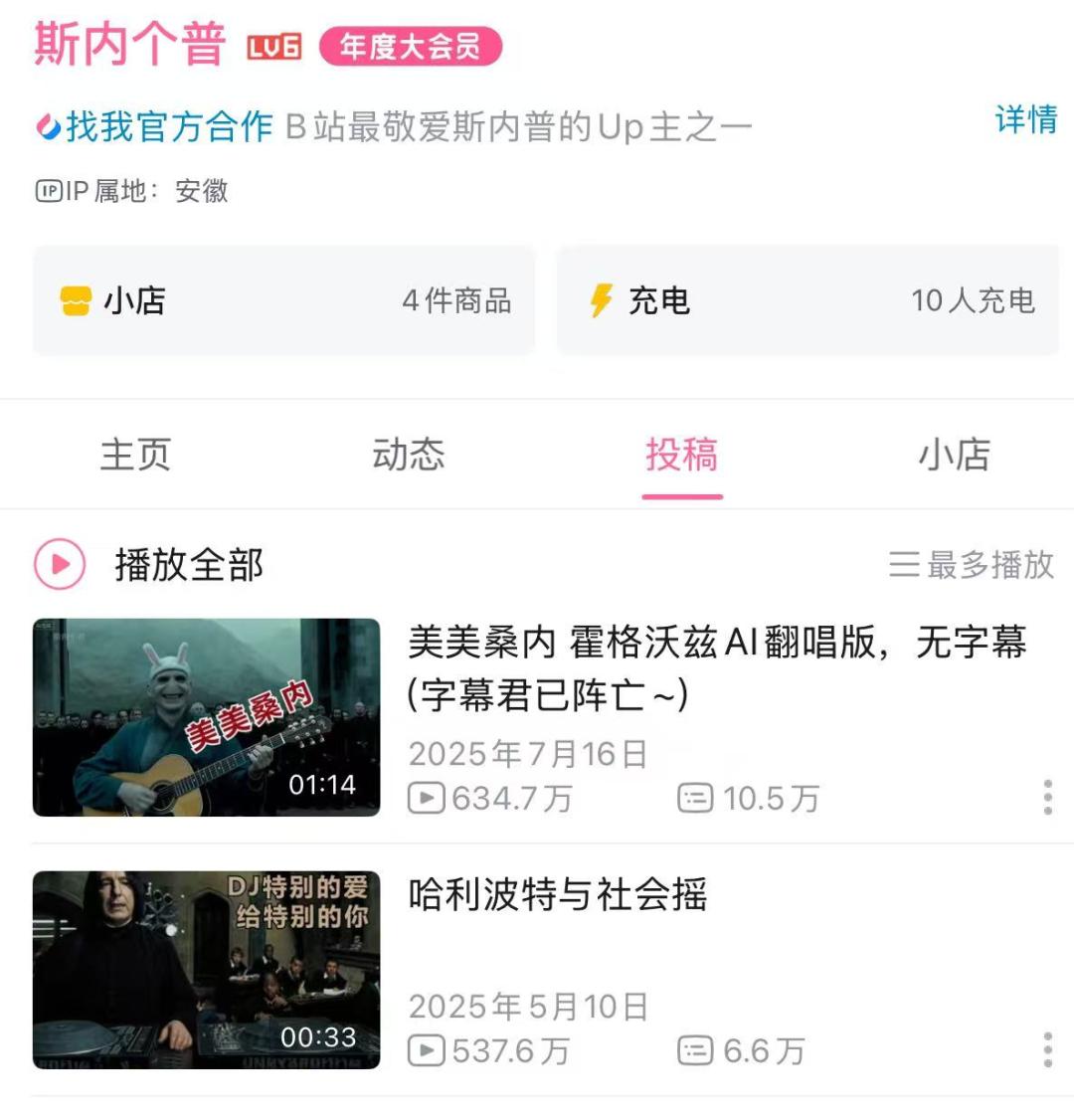 类似的共创热潮也发生在《哈利波特》IP上。B站up“斯内个普”用AI生成并制作了《哈利波特与社会摇》《假如霍格沃茨全员唱“爱你”》等多个视频。其中,《美美桑内 霍格沃茨AI翻唱版》的播放量高达634万(截至1月30日)。