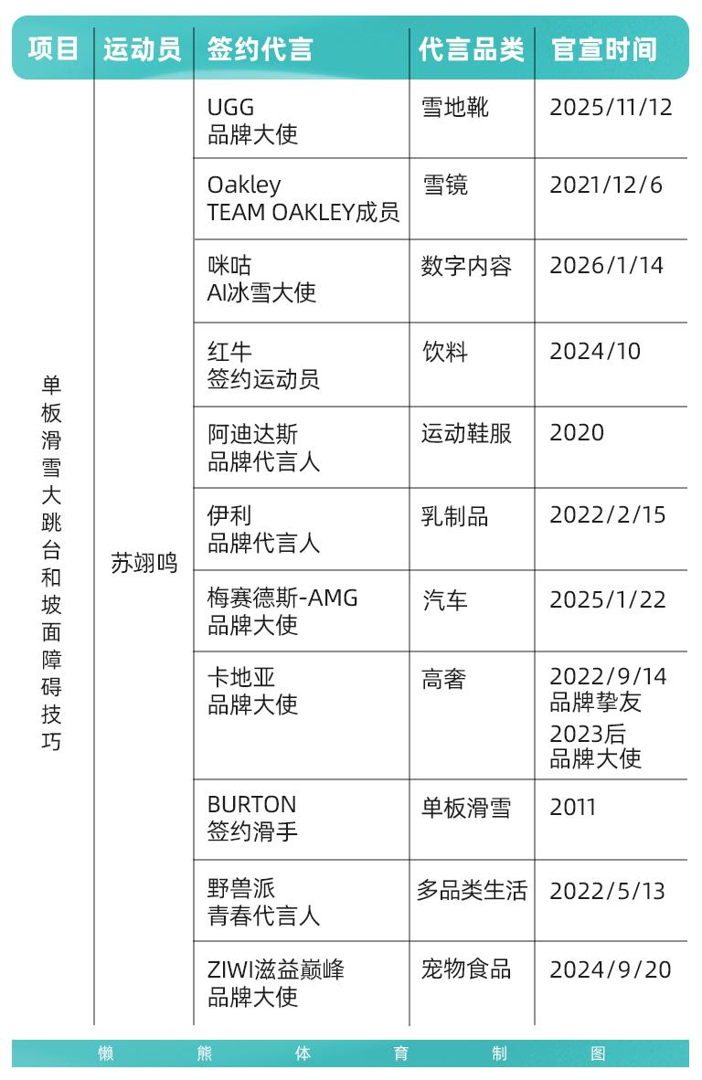 商业价值同样显著的苏翊鸣,品牌合作数量已达到两位数。北京冬奥会一举斩获男子单板滑雪大跳台金牌和男子单板滑雪坡面障碍技巧银牌后,他持续吸引品牌关注。2025-26赛季,他以两金一银一铜的成绩,在本赛季单板滑雪世界杯积分榜上位列第一。