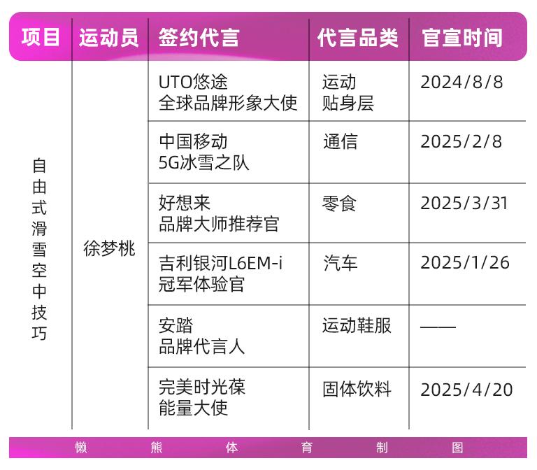 徐梦桃的商业价值也随之进一步释放,除长期合作的安踏外,她在近两年来相继签约UTO悠途、吉利银河、中国移动等品牌,并在2025年12月加入TCL之队。