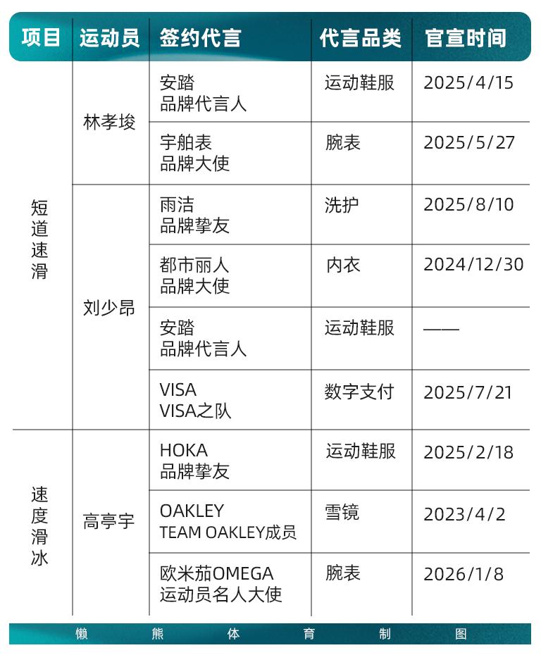 在顶流光环之外,还有一些战绩出色、但曝光相对有限的运动员,也在较大程度上获得了品牌的青睐。比如林孝埈,2025年初,他在哈尔滨亚冬会男子500米项目中夺冠,成为历史上首位也是至今唯一在冬奥会、冬青奥会、世锦赛、世界杯和亚冬会均夺冠的“全冠军”选手。随后的2025年4月和5月,他就接连签约安踏和宇舶表。今年1月29日,更成为沃尔沃的品牌挚友。再比如中国男子速滑冬奥首金得主的高亭宇,他先后与Oakley、HOKA及欧米茄达成合作;还有短道速滑人气选手刘少昂,也握有安踏、VISA、雨洁、都市丽人共四大品牌代言。