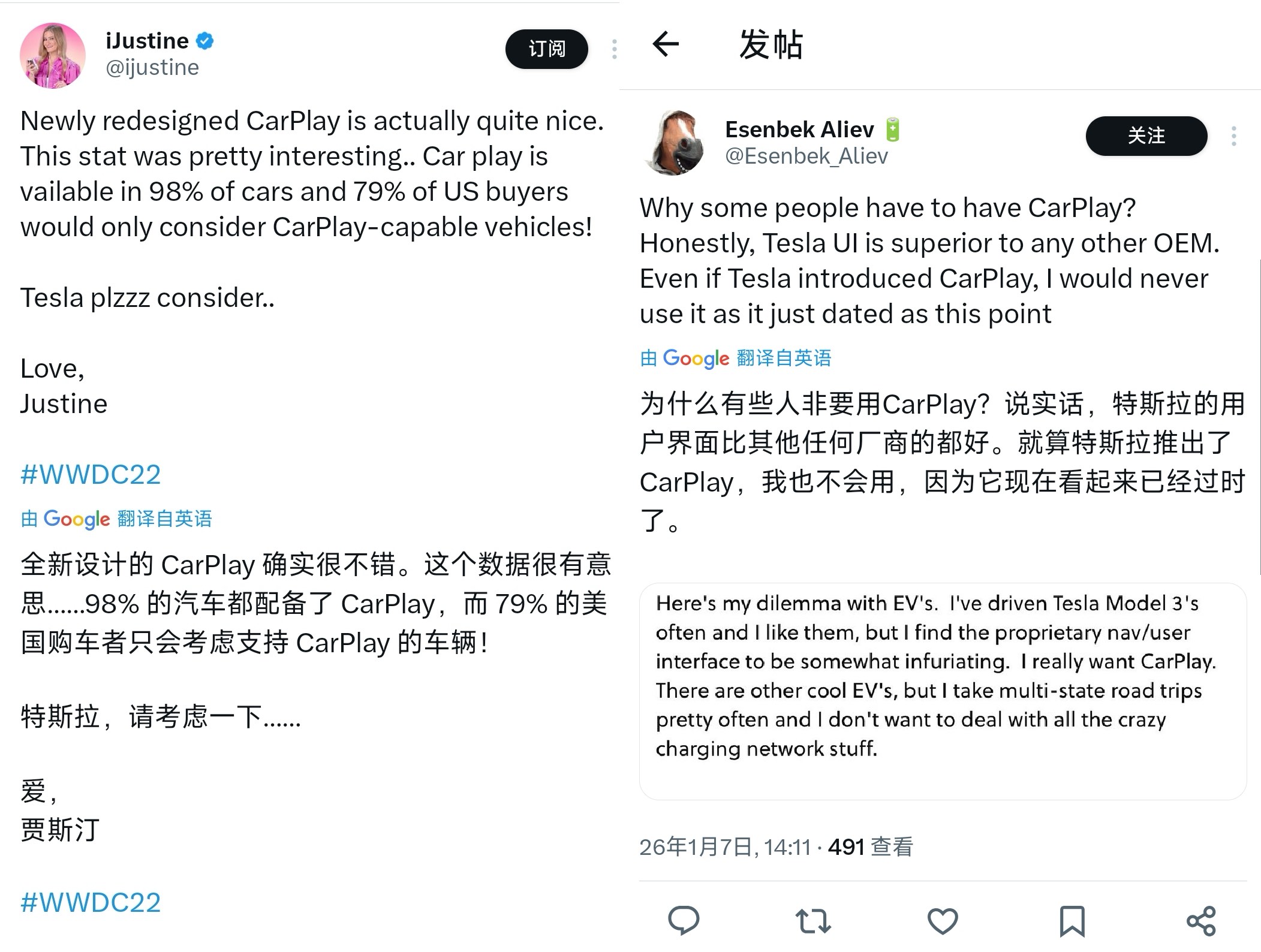 说白了,特斯拉接入CarPlay,只是补个体验短板的商业选择,压根不是认可苹果那套深度整合方案。