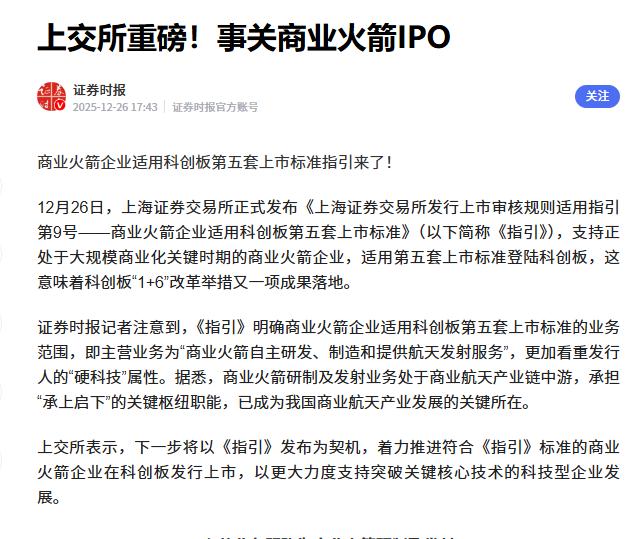 二是金融上,成立国家商业航天发展基金,引导地方和社会资本进入到商业火箭领域,更重要的是为商业火箭企业的上市打通了上市的通道,2025年12月,上交所发布《上海证券交易所发行上市审核规则适用指引第9号——商业火箭企业适用科创板第五套上市标准》,支持为尚未盈利但掌握核心技术的商业火箭企业上市IPO。