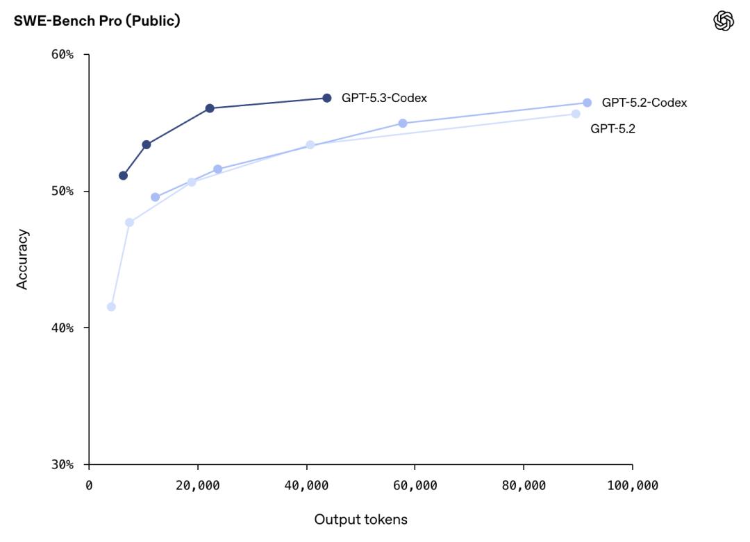 在覆盖四种编程语言,不仅抗污染,还全是真实世界的硬核工程难题的SWE-Bench Pro 基准测试中, GPT-5.3-Codex 也表现出了 SOTA 水准, 而且用的 Token 比以往任何模型都少。