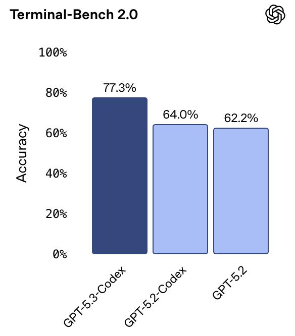 而在 Terminal-Bench 2.0(命令行操作基准测试)中,它更是拿下了 77.3% 的高分,把 GPT-5.2(62.2%)远远甩在身后。