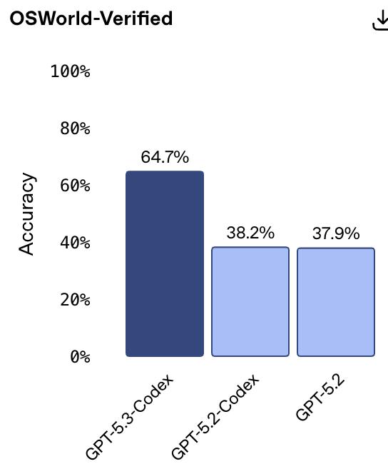 还记得那个模拟人类操作电脑的 OSWorld-Verified 基准测试吗?前代模型只有 38.2% 的准确率,连及格线都够不上。但这次,GPT-5.3-Codex 直接跳涨到了 64.7%。