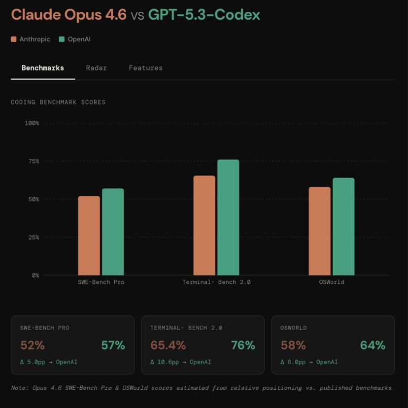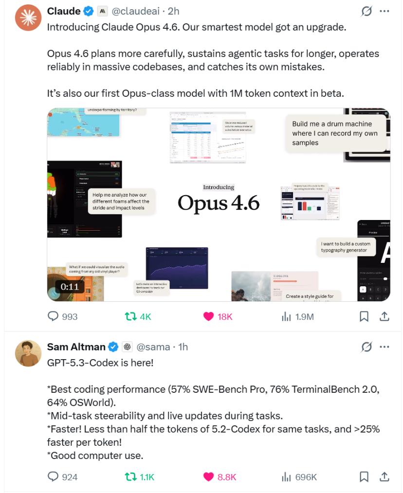 Claude Opus 4.6和GPT-5.3 Codex在相隔不到一个小时的时间里先后发布。