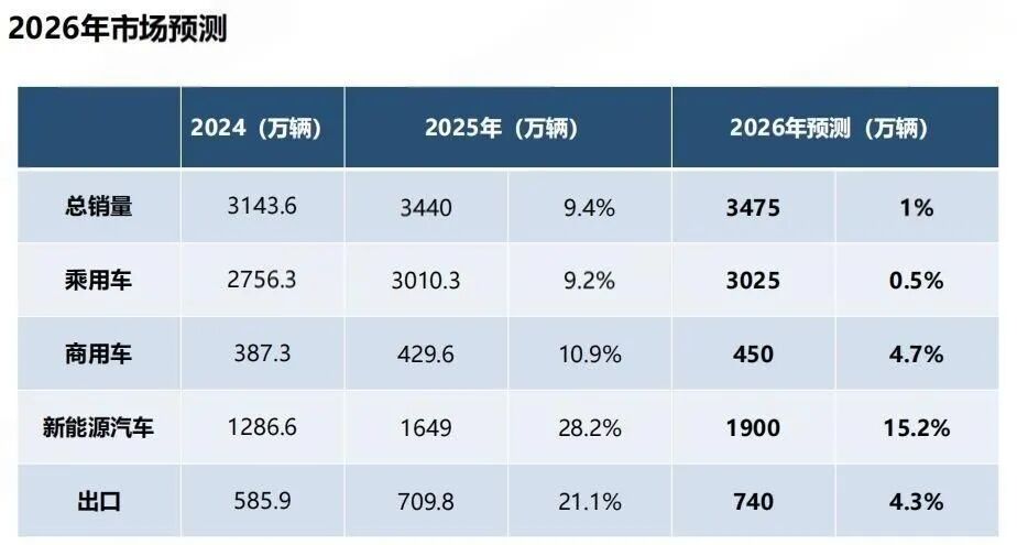 尽管2026年汽车“两新”与新能源汽车车辆购置税政策有所调整,但其对于车市刺激作用仍旧重要。“‘两新’政策平稳有序衔接,为2026年车市稳健增长提供了保障。”中国汽车工业协会副秘书长陈士华预计,2026年,中国汽车总销量为3475万辆,同比增长1%。其中,乘用车总销量为3025万辆,同比增长0.5%;新能源汽车总销量为1900万辆,同比增长15.2%。