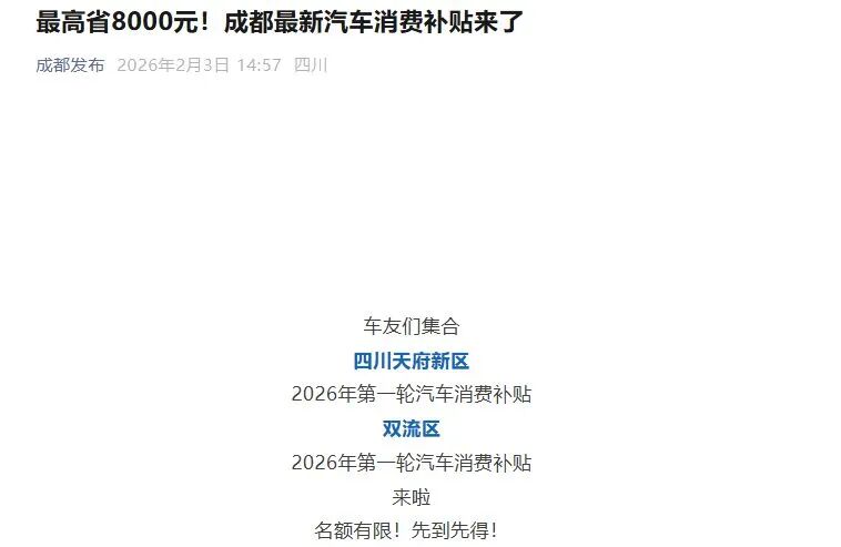 在各地陆续推动汽车以旧更新政策落实的同时,成都市最新汽车消费补贴也上线了。2月3日,据“成都发布”消息,成都高新区2026年第一轮汽车消费补贴活动启动,补贴总预算不超过3100万元,其中,新车消费补贴规模2900万元,二手车消费补贴规模200万元。消费者购置新车或二手车,满足相应条件有机会获得至高8000元成都高新区购车补贴,其中,购买二手车最高申请4000元购车补贴。