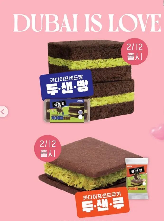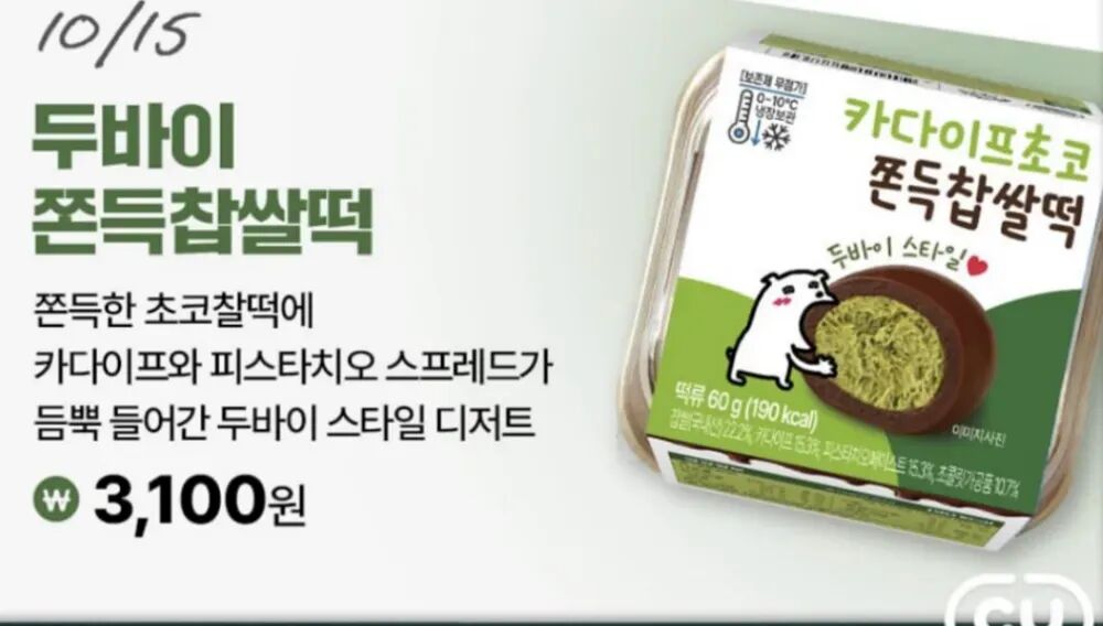 2025年10月15日,韩国CU便利店在就推出了一款名为“두바이 쫀득 찹쌀떡”(中译:一口迪拜巧克力糯米糍)。据了解,CU便利店迪拜软曲奇每块售价3000韩元,且由于采用手工制作,每家门店每天限售两块。[6]