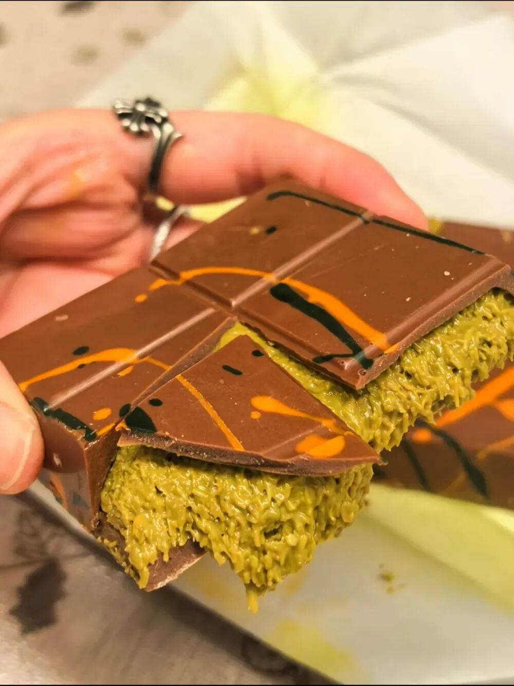 迪拜巧克力,是一种以牛奶巧克力为外壳,内里包裹着开心果酱与卡达伊夫(即Kadaif,一种中东风味的细面条)碎丝的甜点。这款甜品灵感源自中东经典甜品库纳法(Knafeh),最早由阿联酋迪拜的 FIX Dessert Chocolatier 在2021年创制。[3]它将多层次口感结合在一起,既有巧克力的浓郁、开心果的丝滑,又有卡达伊夫碎层的酥脆,咬下去甚至会发出清晰的“咔嚓”声。