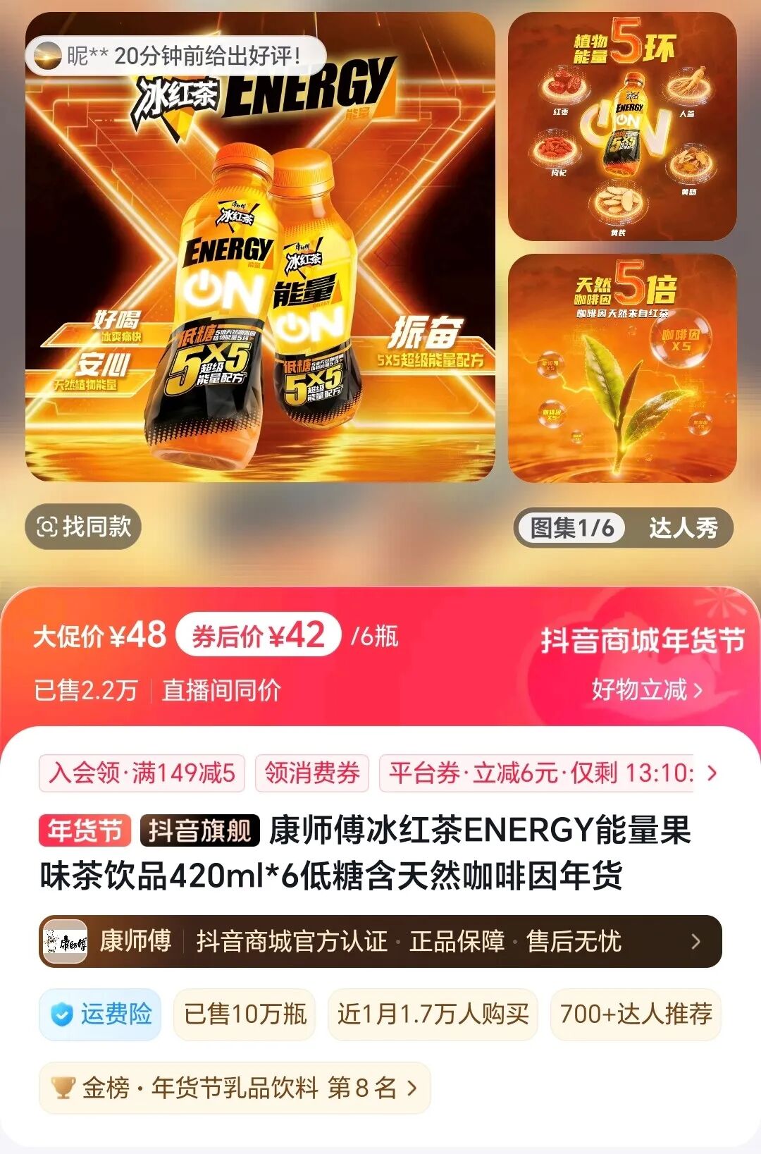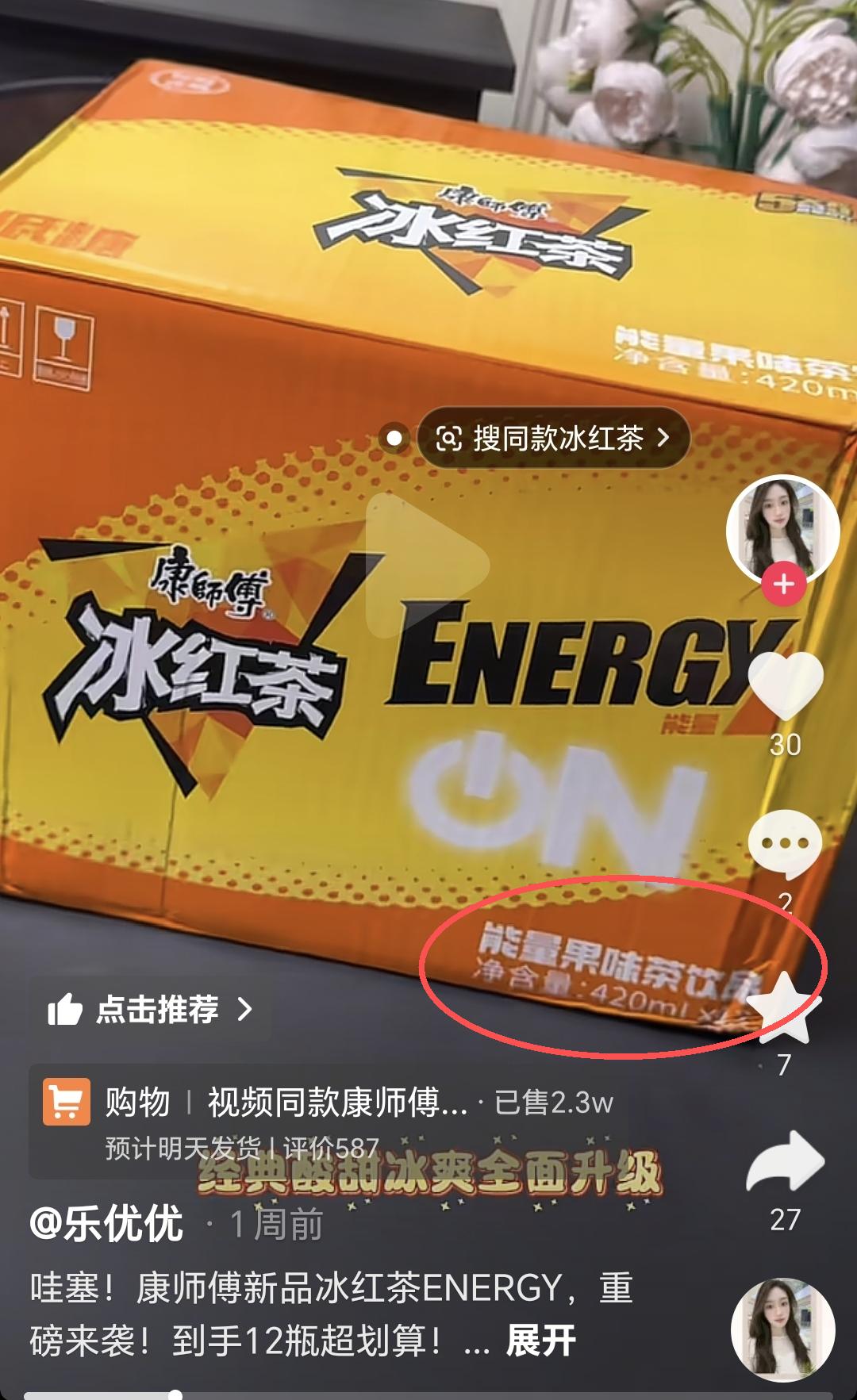 2026年1月29日,康师傅在抖音平台上线了一款名为“冰红茶ENERGY”的新品。根据抖音商城商品详情页显示,截至2026年2月5日,该产品累计销量达到2.2万箱。同时,抖音“康师傅能量冰红茶”话题下视频累计播放量达到344.1万次。