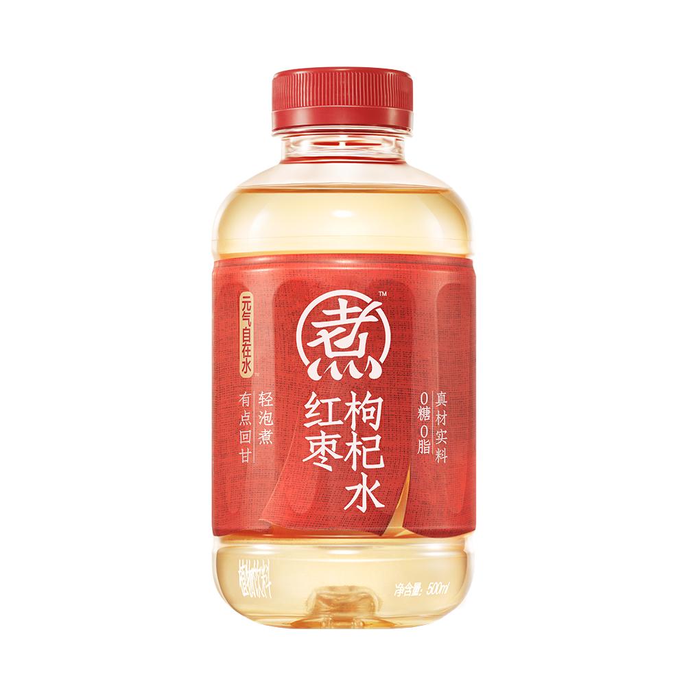 瓶内茶汤的配方,则在经典冰红茶配方的基础上添加了枸杞、红枣、人参、黄芪、黄精5种药食同源的成分。近些年,这几种食材常应用在“养生水”产品中,如元气森林好自在的“红枣枸杞水”,盒马等品牌推出的“苹果黄芪水”等。这些产品常将“元气”“好状态”等作为卖点。