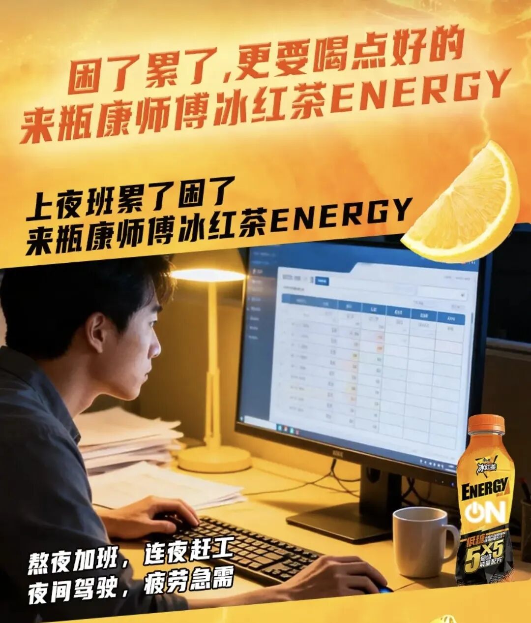 本次推出的冰红茶ENERGY,则是切中了熬夜、加班等能量饮料的核心场景。