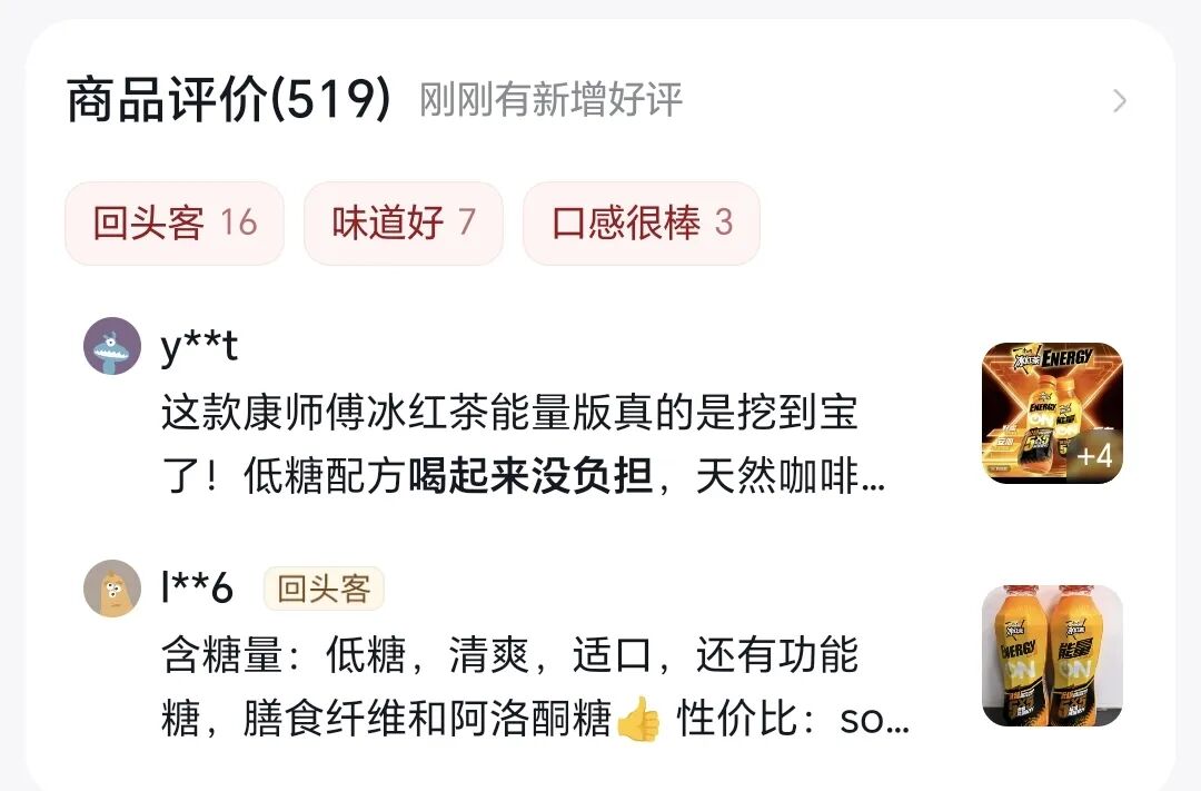 还有的人把红牛等能量饮料作为参照物,对比了味道上的不同。在评论区,可以看到“相比于其它功能饮料,康师傅的茶味还是比较明显的”“比普通能量饮料好喝”“没有red bull好喝”等评论。