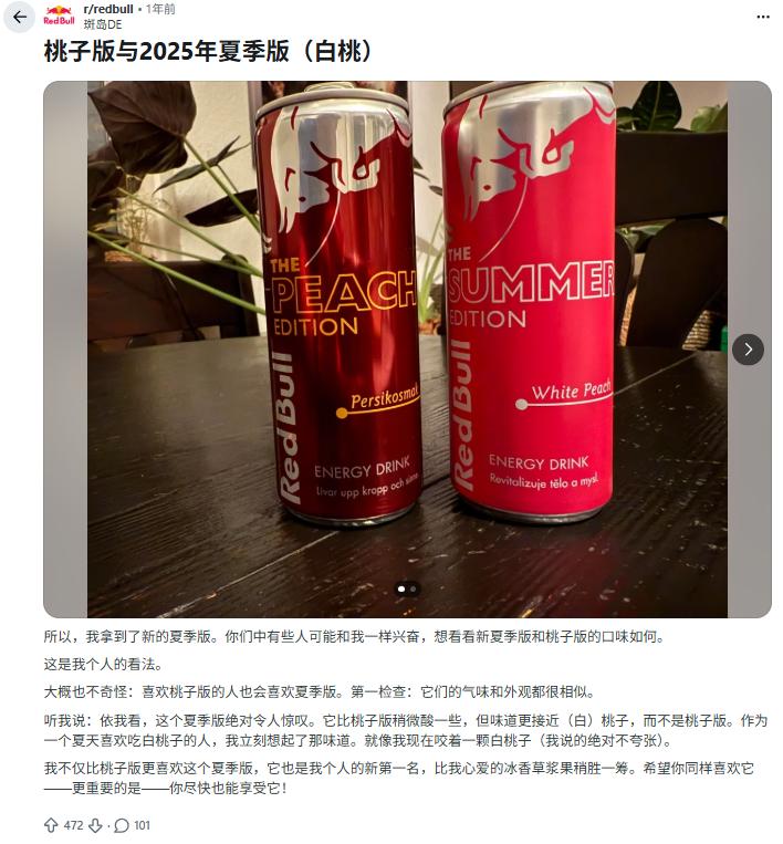 红牛的季节限定风味,吸引了一批粉丝。在Reddit上,有网友就发帖表示,白桃复配风味的2025年夏季款红牛,喝下去“就像咬下一口新鲜的白桃”,并且称这款产品是自己心中Top1的红牛饮料。这则帖子目前已被点赞472次。