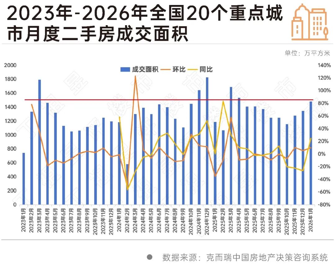 数据显示,2026年1月,重点20个城市二手房成交面积1483万平方米,环比上涨10%,同比上涨25%。